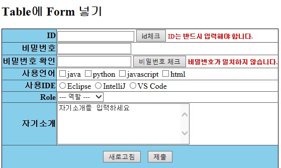 <!DOCTYPE html> <html> <head> <meta charset="UTF-8"> <title>Form Elements</title> <style> table{ border: solid 1px; border-collapse: collapse; } th{ background-color: skyblue; text-align: right; } #btn{ background-color: skyblue; text-align: center; } #btn_submit{ margin: 10px; } #idCheckMsg, #pwCheckMsg{ color: red; font-weight: bold; font-size: 12px; } </style> <script> function idCheck() { let userId = document.getElementById("userId").value; if(userId == '') { let idCheckMsg = document.getElementById("idCheckMsg"); idCheckMsg.innerHTML = 'ID는 반드시 입력해야 합니다.'; } } function pwCheck(){ let pw1 = document.getElementById("pw1"); let pw2 = document.getElementById("pw2"); if(pw1.value != pw2.value) { let pwCheckMsg = document.getElementById("pwCheckMsg"); pw1.value = ""; pw2.value = ""; pwCheckMsg.innerHTML = '비밀번호가 일치하지 않습니다.'; } else { pwCheckMsg.innerHTML = ''; } } </script> </head> <body> <!-- 3x2 테이블에 폼 요소 넣기 --> <h2>Table에 Form 넣기</h2> <form action=""> <table border=1> <tr> <th>ID </th> <td> <input type="text" id="userId"> <input type="button" value="id체크" onclick="idCheck()"> <span id="idCheckMsg"></span> </td> </tr> <tr> <th>비밀번호 </th> <td> <input type="password" id="pw1"> </td> </tr> <tr> <th>비밀번호 확인</th> <td> <input type="password" id="pw2"> <input type="button" value="비밀번호 체크" onclick="pwCheck()"> <span id="pwCheckMsg"></span> </td> </tr> <tr> <th>사용언어</th> <td> <input type="checkbox">java <input type="checkbox">python <input type="checkbox">javascript <input type="checkbox">html </td> </tr> <tr> <th>사용IDE</th> <td> <input type="radio" name="ide">Eclipse <input type="radio" name="ide">IntelliJ <input type="radio" name="ide">VS Code </td> </tr> <tr> <th>Role</th> <td> <select> <option>--- 역할 --- <option>디자이너 <option>프로그래머 <option>설계 <option>개발자 <option>퍼블리셔 </select> </td> </tr> <tr> <th>자기소개</th> <td><textarea cols="30" rows="5">자기소개를 입력하세요</textarea></td> </tr> <tr> <td id="btn" colspan="2"> <input type="reset" value="새로고침"> <input type="submit" id="btn_submit" value="제출"> </td> </tr> </table> </form> </body> </html>
