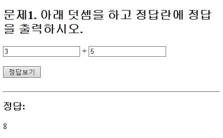 <!DOCTYPE html> <html> <head> <meta charset="UTF-8"> <title>웹페이지 구성</title> <script> function plus(){ alert('문제 풀이 중...'); let n1 = document.getElementById("n1"); let n2 = document.getElementById("n2"); // body의 num1과 num2를 가져와서 정수로 변환 후 덧셈하여 temp에 저장 let temp = parseInt(n1.value) + parseInt(n2.value); // 위에서 덧셈한 temp값을 body의 result 위치에 출력되도록 let result = document.getElementById("result"); result.innerHTML = temp; } </script> </head> <body> <h2>문제1. 아래 덧셈을 하고 정답란에 정답을 출력하시오.</h2> <input type="text" id="n1"> <span> + </span> <input type="text" id="n2"> <br><br> <input type="button" value="정답보기" onclick="plus()"> <br><br><hr> <h3>정답: </h3> <span id="result"></span> </body> </html>