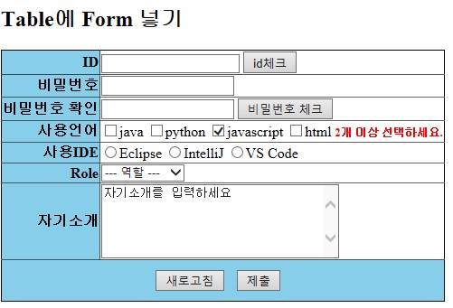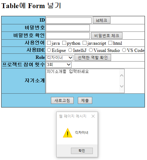 <!DOCTYPE html> <html> <head> <meta charset="UTF-8"> <title>Form Elements</title> <style> table{ border: solid 1px; border-collapse: collapse; } th{ background-color: skyblue; text-align: right; } #btn{ background-color: skyblue; text-align: center; } #btn_submit{ margin: 10px; } </style> <script> function idCheck() { let userId = document.getElementById("userId").value; if(userId == '') { alert('id는 반드시 입력해야 합니다.'); } } </script> </head> <body> <!-- 3x2 테이블에 폼 요소 넣기 --> <h2>Table에 Form 넣기</h2> <form action=""> <table border=1> <tr> <th>ID</th> <td><input type="text" id="userId"></td> </tr> <tr> <th>비밀번호 </th> <td><input type="password"></td> </tr> <tr> <th>사용언어</th> <td> <input type="checkbox">java <input type="checkbox">python <input type="checkbox">javascript <input type="checkbox">html </td> </tr> <tr> <th>사용IDE</th> <td> <input type="radio" name="ide">Eclipse <input type="radio" name="ide">IntelliJ <input type="radio" name="ide">VS Code </td> </tr> <tr> <th>Role</th> <td> <select> <option>--- 역할 --- <option>디자이너 <option>프로그래머 <option>설계 <option>개발자 <option>퍼블리셔 </select> </td> </tr> <tr> <th>자기소개</th> <td><textarea cols="30" rows="5">자기소개를 입력하세요</textarea></td> </tr> <tr> <td id="btn" colspan="2"> <input type="button" value="id체크" onclick="idCheck()"> <input type="reset" value="새로고침"> <input type="submit" id="btn_submit" value="제출"> </td> </tr> </table> </form> </body> </html>