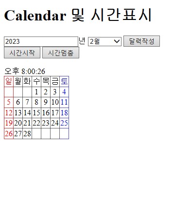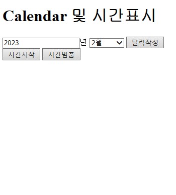 <!DOCTYPE html> <html> <head> <meta charset="UTF-8"> <title>Quiz</title> <link href="../css/style.css" type="text/css" rel="stylesheet"> <script type="text/javascript" src="../js/solution.js"> </script> </head> <body> <h1>Calendar 및 시간표시</h1> <input type="text" value="2023" id="year">년 <select id="index"> <option>월 선택 <option value='1'>1월 <option value='2' selected>2월 <option value='3'>3월 <option value='4'>4월 <option value='5'>5월 <option value='6'>6월 <option value='7'>7월 <option value='8'>8월 <option value='9'>9월 <option value='10'>10월 <option value='11'>11월 <option value='12'>12월 </select> <input type="button" value="달력작성" onclick="makeCalendar(year.value, index.value)"><br> <input type="button" value="시간시작" onclick="displayTime()" class='btn'> <input type="button" value="시간멈춤" onclick="stopTime()" class='btn'> <br><br> <span id="time"></span> <span id="calendar"></span> <span id="test"></span> </body> </html>solution.js