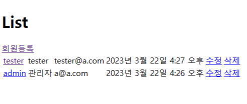 def delete(request, user_id): member = Member.objects.get(userId = user_id).delete() return redirect('../list')여기까지가 가장 기본적인 CRUD 코드이다!
