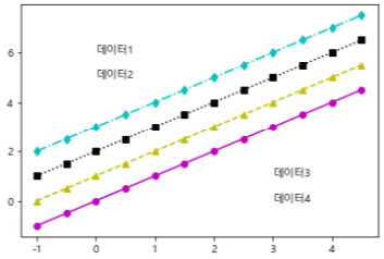 from matplotlib import pyplot import numpy # 데이터 생성 x = numpy.arange(-1, 5, 0.5) # 0~4.5 배열 생성 y1 = x y2 = x + 1 y3 = x + 2 y4 = x + 3 # 그래프 출력 # 선 색상, 선 스타일, 마커를 혼합해서 지정 pyplot.plot(x, y1, 'm-o', x, y2, 'y--^', x, y3, 'k:s', x, y4, 'c-.d') pyplot.xlabel('X-axis') # x축에 문자열 출력 pyplot.ylabel('Y-axis') # y축에 문자열 출력 pyplot.title('Plot Graph') # 제목 출력 pyplot.grid(True) # 격자 출력, True는 생략 가능 pyplot.legend(['data1', 'data2', 'data3', 'data4']) # 범례 출력 pyplot.show() # 한글 설정 pyplot.rcParams['font.family'] = 'Malgun Gothic' # 맑은 고딕으로 설정 pyplot.rcParams['axes.unicode_minus'] = False # 마이너스 기호 깨짐 방지 pyplot.plot(x, y1, 'm-o', x, y2, 'y--^', x, y3, 'k:s', x, y4, 'c-.d') pyplot.xlabel('X축') # x축에 문자열 출력 pyplot.ylabel('Y축') # y축에 문자열 출력 pyplot.title('선 그리기') # 제목 출력 pyplot.grid(True) # 격자 출력, True는 생략 가능 pyplot.legend(['데이터1', '데이터2', '데이터3', '데이터4']) # 범례 출력 pyplot.show() pyplot.plot(x, y1, 'm-o', x, y2, 'y--^', x, y3, 'k:s', x, y4, 'c-.d') pyplot.text(0, 6, '데이터1') # (0, 6) 좌표에 '데이터1' 출력 pyplot.text(0, 5, '데이터2') # (0, 5) 좌표에 '데이터2' 출력 pyplot.text(3, 1, '데이터3') # (3, 1) 좌표에 '데이터3' 출력 pyplot.text(3, 0, '데이터4') # (3, 0) 좌표에 '데이터4' 출력 pyplot.show()